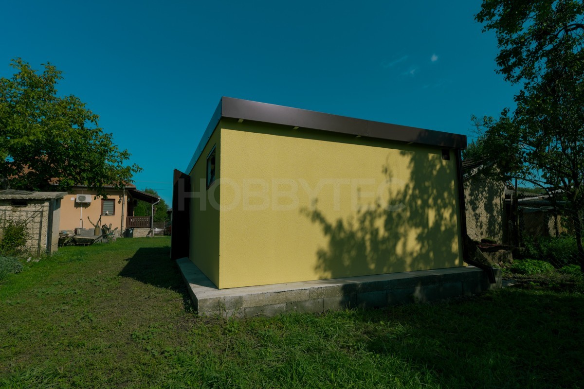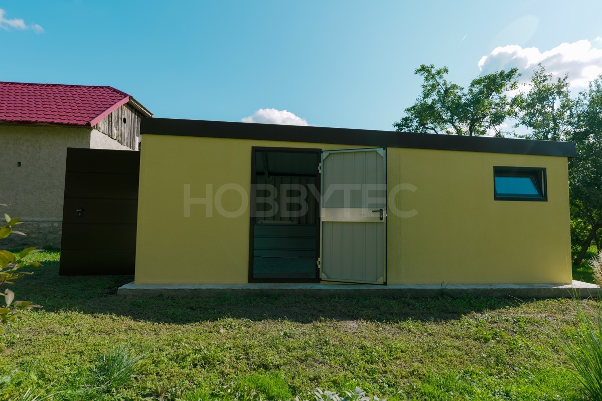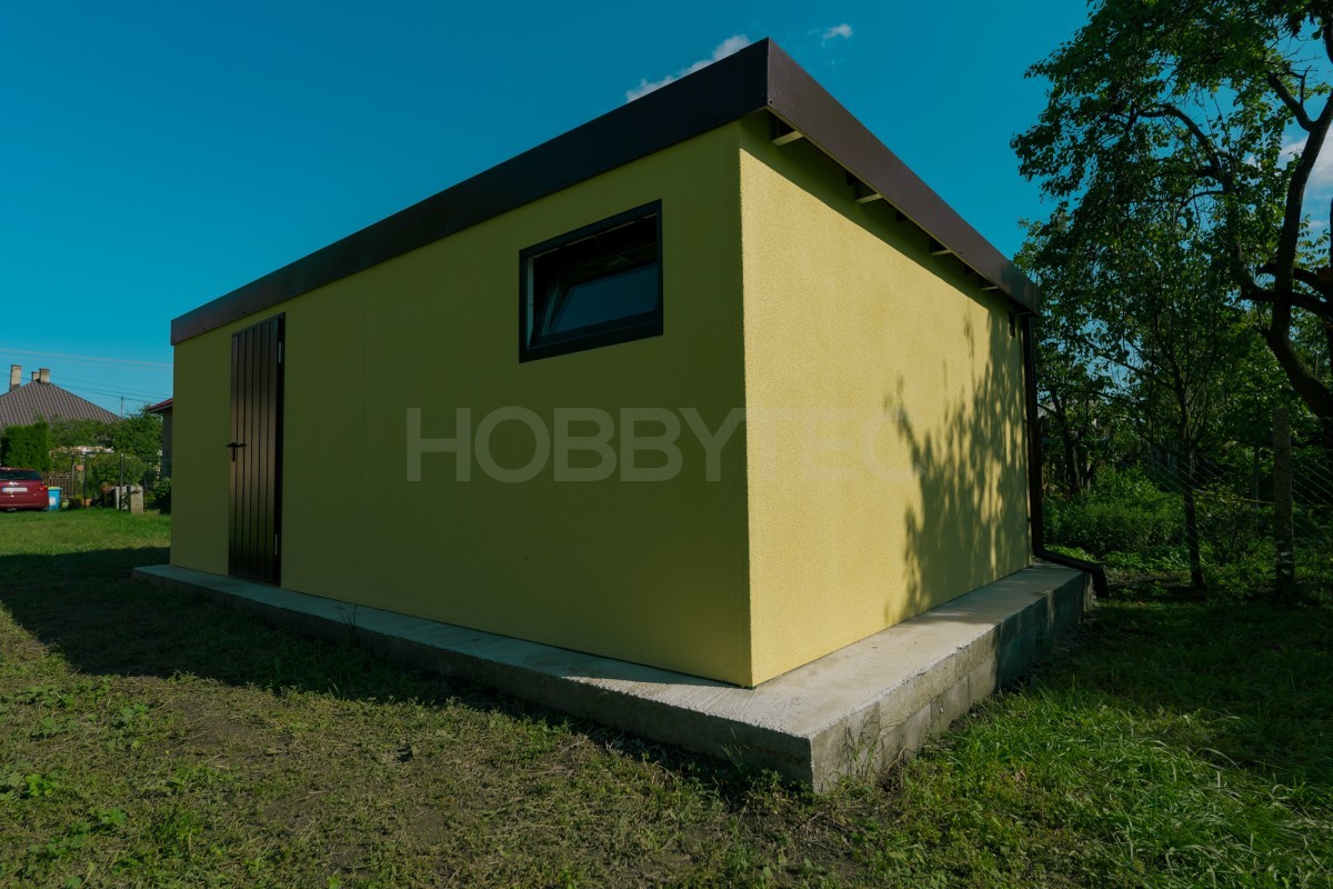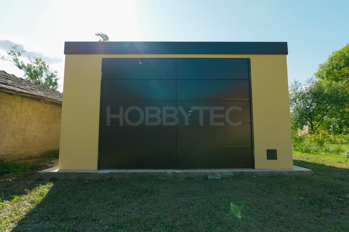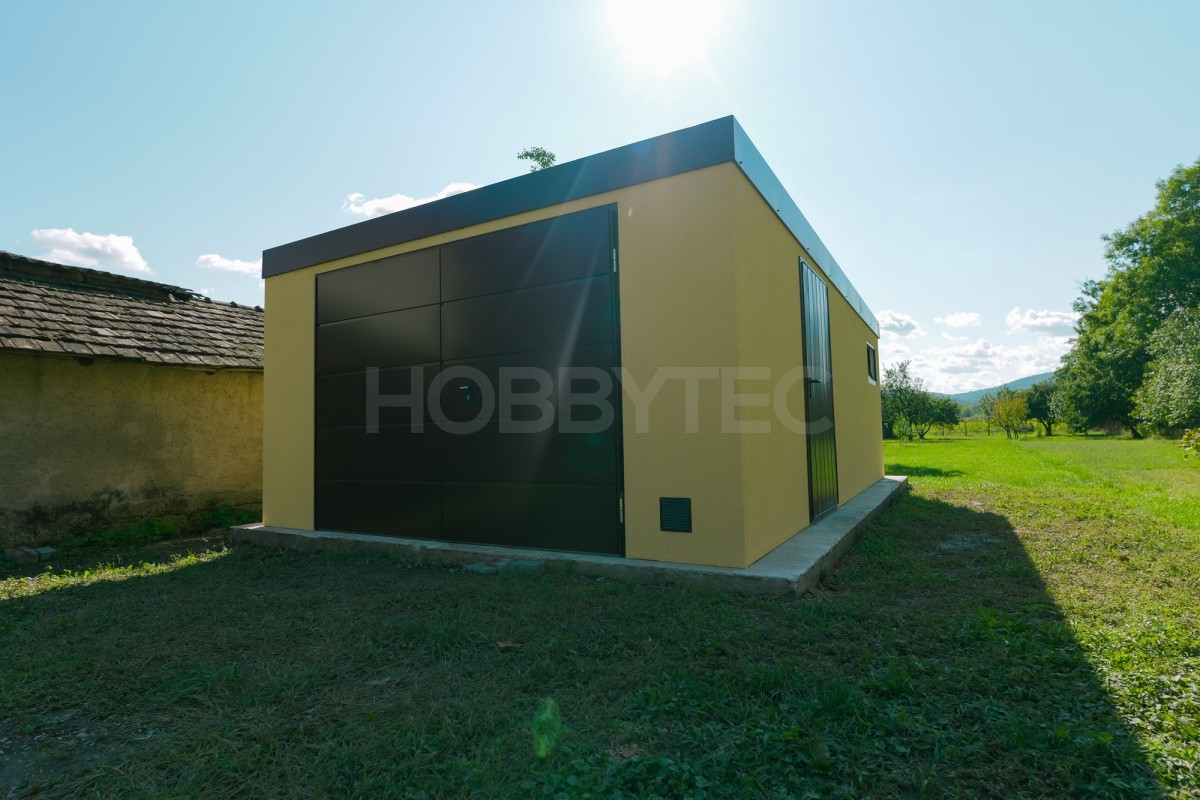 Moderná montovaná garáž a záhradný domček s fasádnou omietkou s hladkými stenami sú na nerozoznanie od murovanej stavby. Moderný dizajn, nadštandardná kvalita a dlhá životnosť pri zachovaní výhod montovanej stavby.